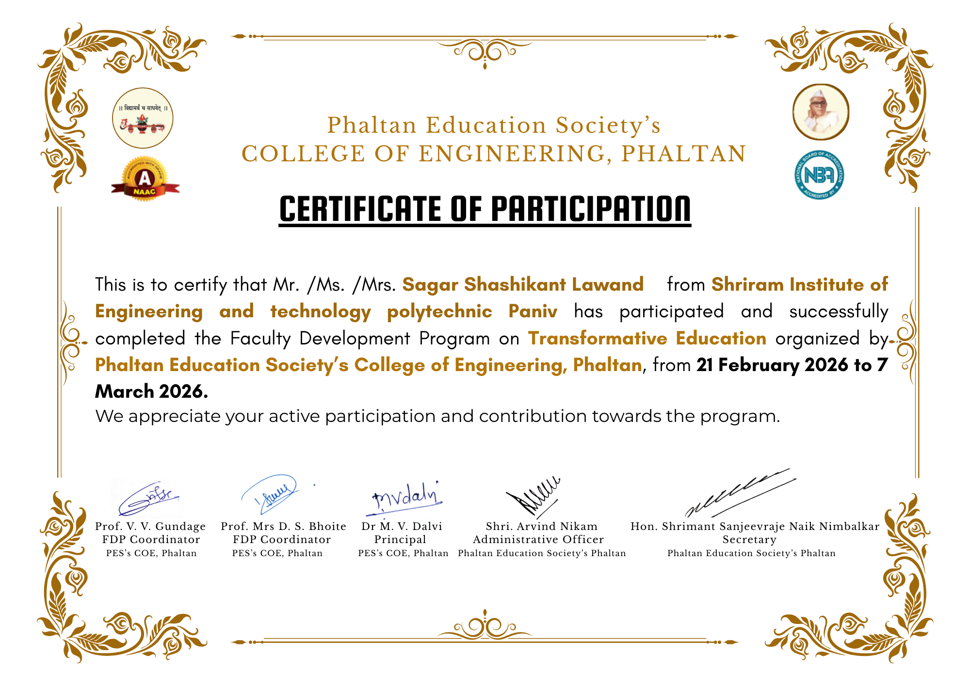 Approved by A.I.C.T.E., New Delhi, DTE, Govt. of Maharashtra Affiliated to Dr. Babasaheb Ambedkar Technological University (Dr. BATU) Lonere, Dist. Raigad (Degree), M.S.B.T.E., Mumbai, (Polytechnic).