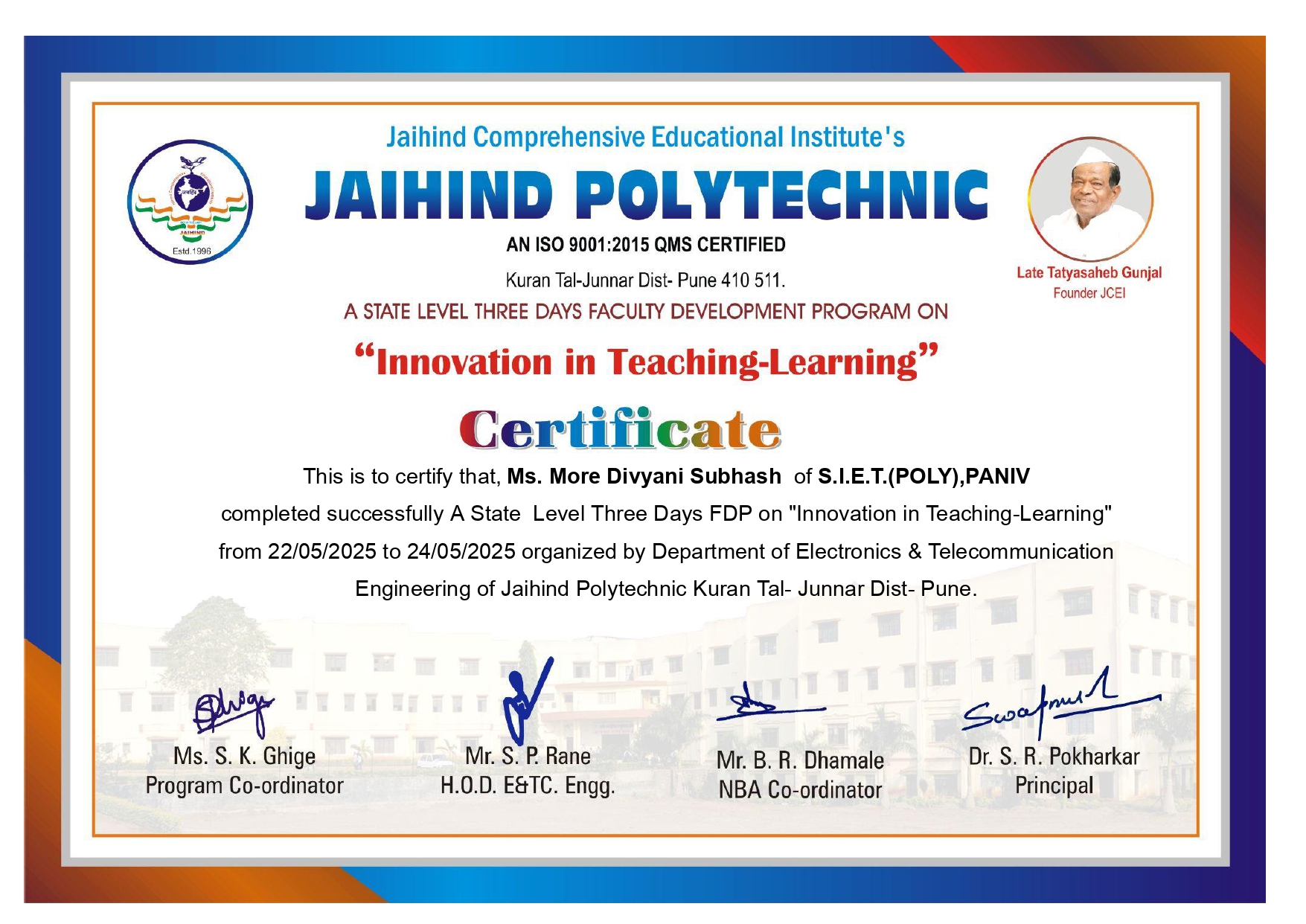 The integration of NPTEL courses into the Electronics & Telecommunication Engineering curriculum at Shriram Institute of Engineering &Technology (Poly), Paniv has proven to be a successful innovation in teaching and learning. By providing students with high-quality learning resources, industry-relevant knowledge, and certification opportunities, this initiative has enhanced the academic experience and employability of students. Moving forward, a structured credit-based system for NPTEL courses can further motivate students to engage in lifelong learning and skill development