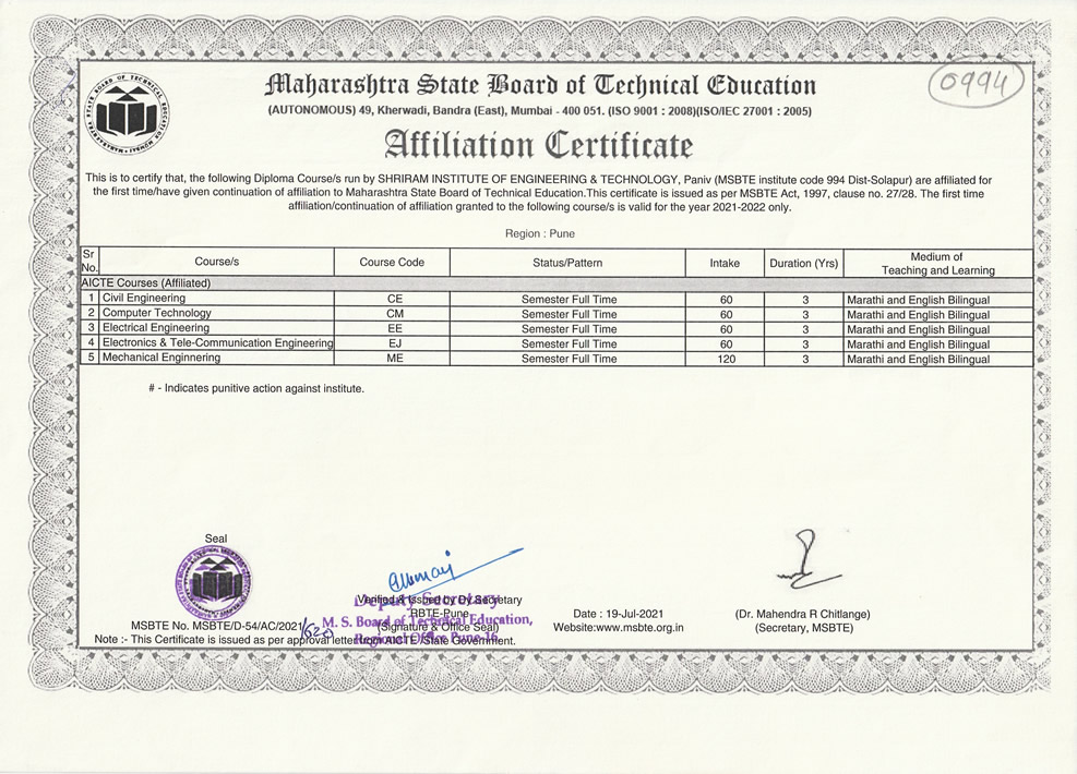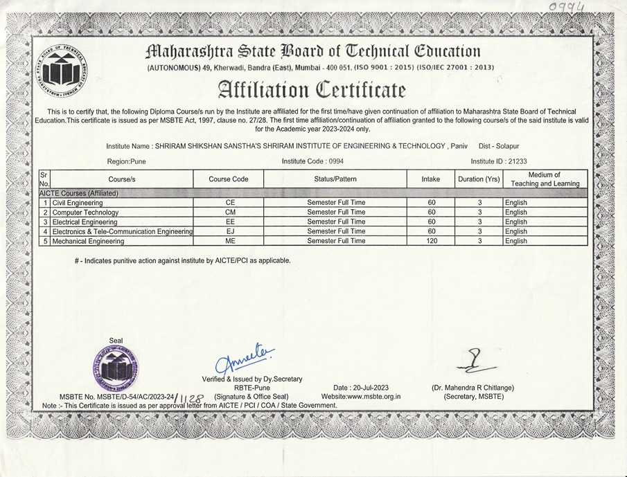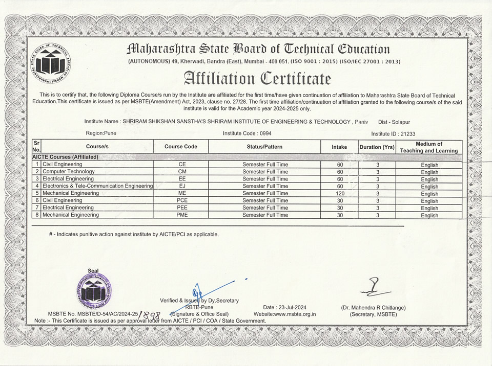 Approved by A.I.C.T.E., New Delhi, DTE, Govt. of Maharashtra Affiliated to Dr. Babasaheb Ambedkar Technological University (Dr. BATU) Lonere, Dist. Raigad (Degree), M.S.B.T.E., Mumbai, (Polytechnic).
